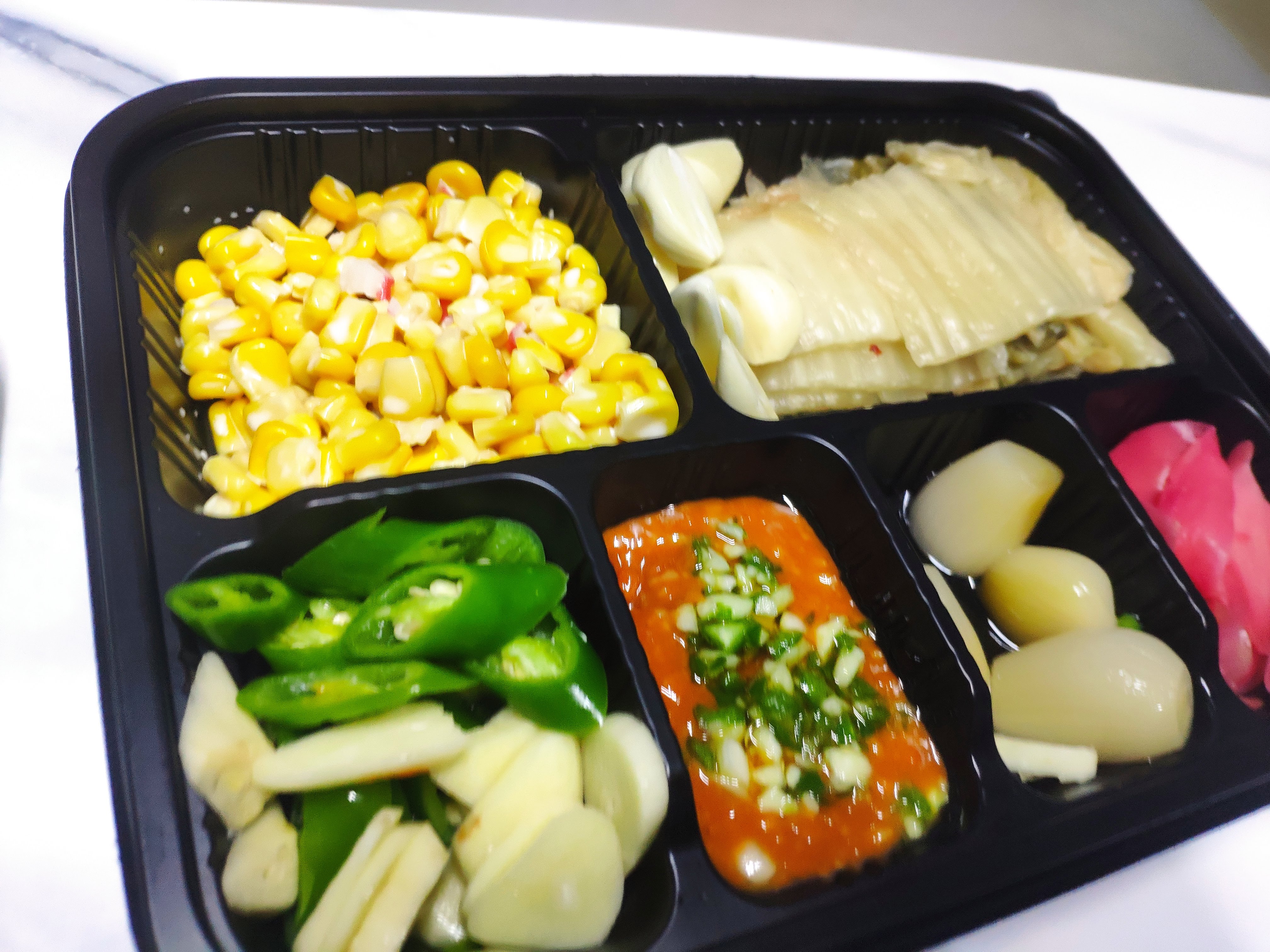 기본 야채 구성은 콘 샐러드, 백김치, 마늘, 고추, 된장, 락교, 생강절임