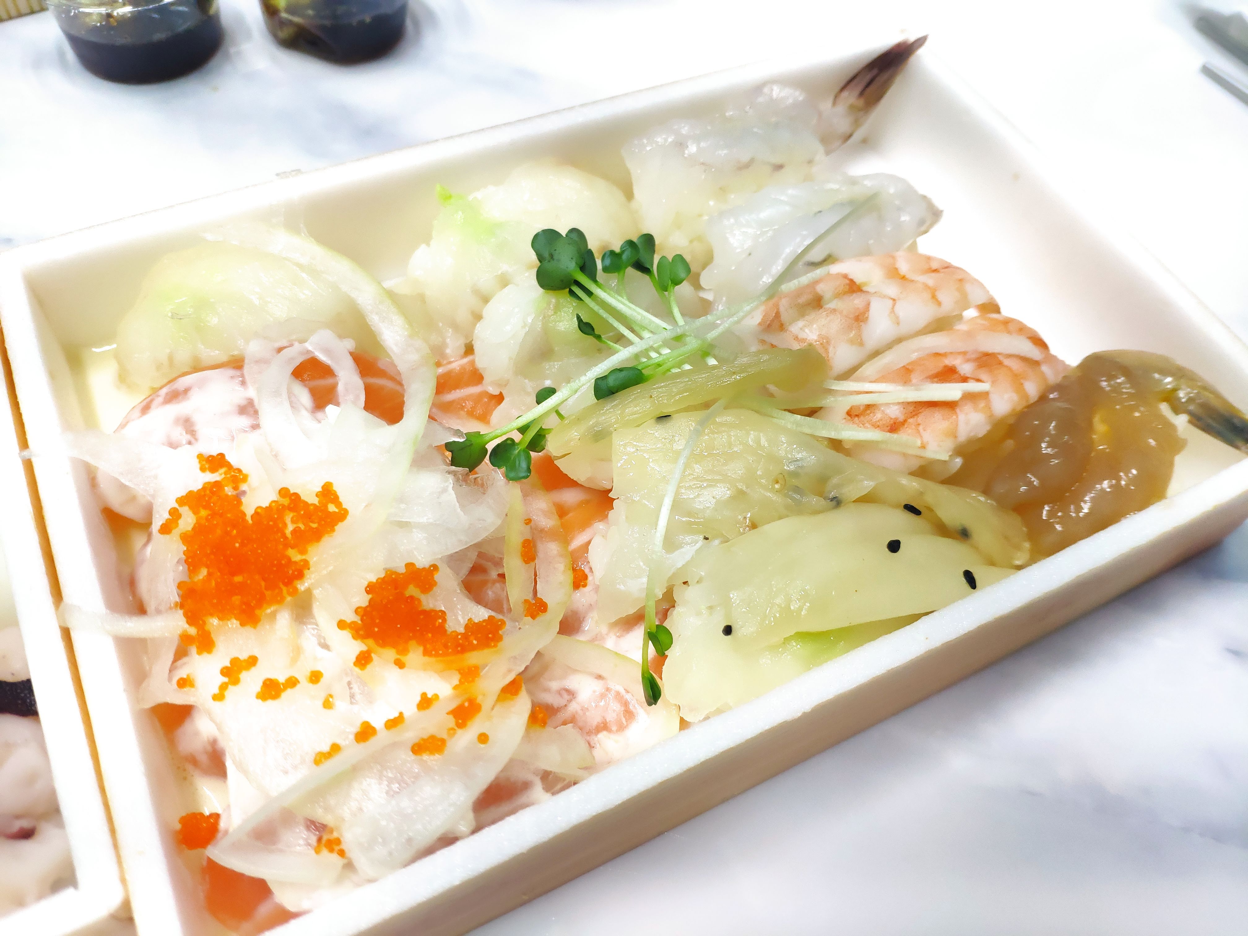 간장새우, 갈릭오징어, 문어, 계란, 장어, 소고기초밥인데