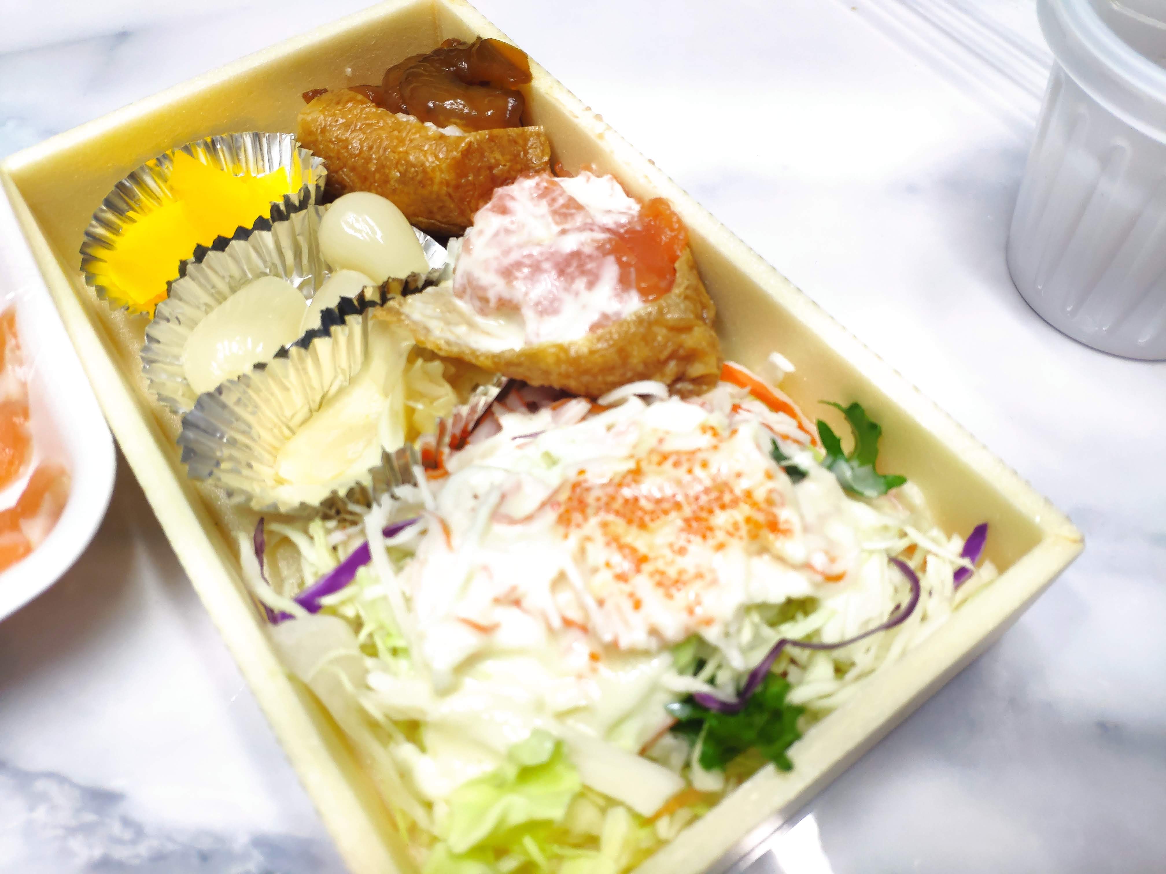 유부초밥, 샐러드, 락교등이 있어서 나름 배 든든하게 잘 먹었습니다.
