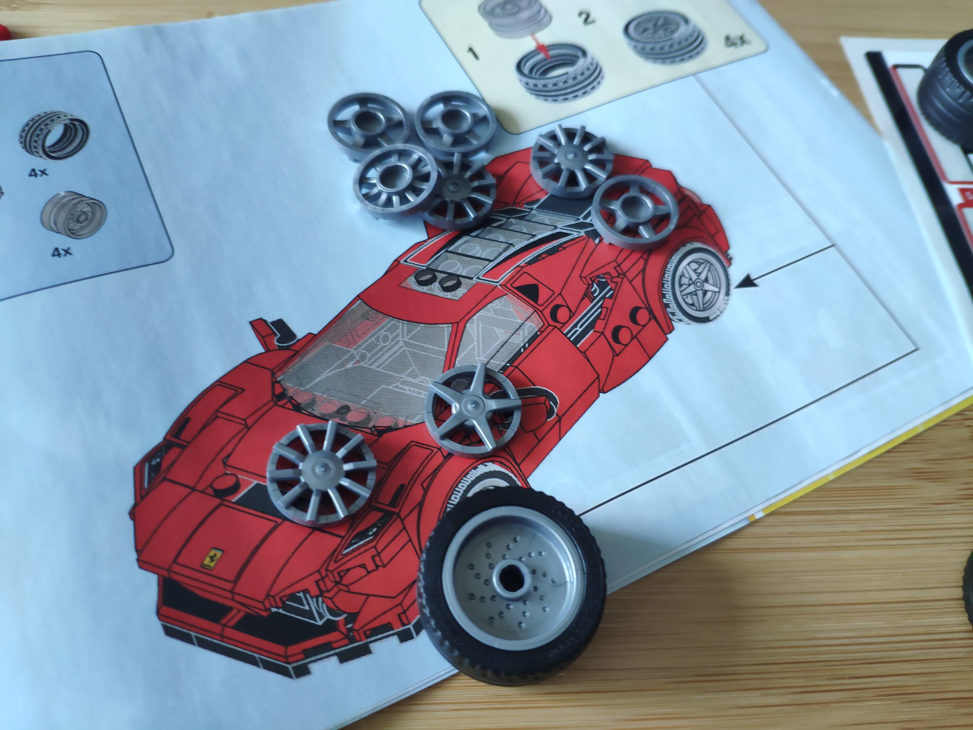 양옆의 문과 사이드 미러까지 달아주고, 마지막으로 바퀴까지 하나씩 조립해주고 나면